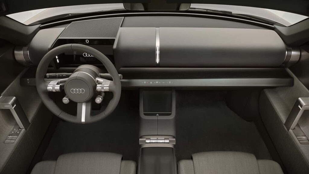 El interior traslada la filosofía de diseño industrial a un ambiente que la marca describe inspirado en la estética de una terminal aeroportuaria. Frente al conductor se encuentra un volante rediseñado y un panel de instrumentos digital. Audi ha implementado un concepto de «tecnología discreta», que incluye una pantalla de infoentretenimiento plegable de 10,4 pulgadas, diseñada para minimizar distracciones cuando no se utiliza. El ambiente se completa con controles climáticos digitales, detalles en aluminio anodizado, iluminación ambiental y el uso predominante de tapicerías textiles sostenibles en lugar de cuero.