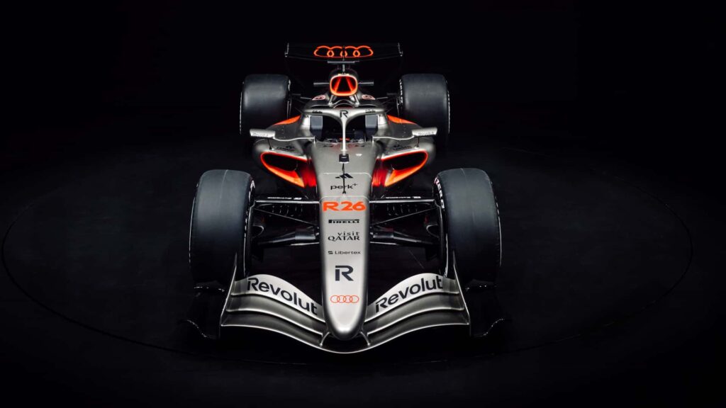 El automóvil, bautizado como Revolut R26, muestra una identidad visual distintiva. Predomina un tono titanio en la carrocería, con amplios contrastes en fibra de carbono negro y acentos en el rojo corporativo de Audi, creando una imagen tecnológica y agresiva. El diseño, que evoluciona del prototipo mostrado anteriormente, busca transmitir una intención clara de competitividad.