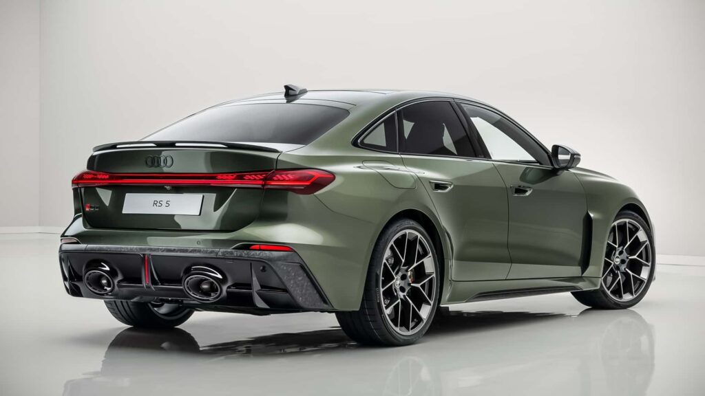 Visualmente, la carrocería presenta los rasgos distintivos de la gama RS. Los pasos de rueda ensanchados, las tomas de aire reforzadas y los escapes de forma ovalada identifican inmediatamente al modelo como la variante más radical de la gama A5. En el apartado lumínico, se incorpora tecnología OLED con firma específica.