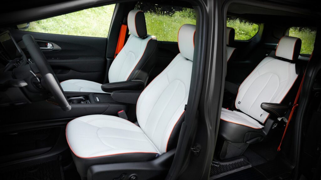 En el interior, el Pacifica Grizzly Peak Concept prioriza la utilidad para largas expediciones. La tercera fila de asientos ha sido retirada para ampliar significativamente el espacio de carga, el cual incluye nuevos puntos de anclaje para asegurar el equipamiento. Los acabados interiores reflejan su carácter especial, con una paleta de colores Cement Gray y Liquid Titanium, asientos revestidos en cuero Katzkin y cinturones de seguridad en color naranja.