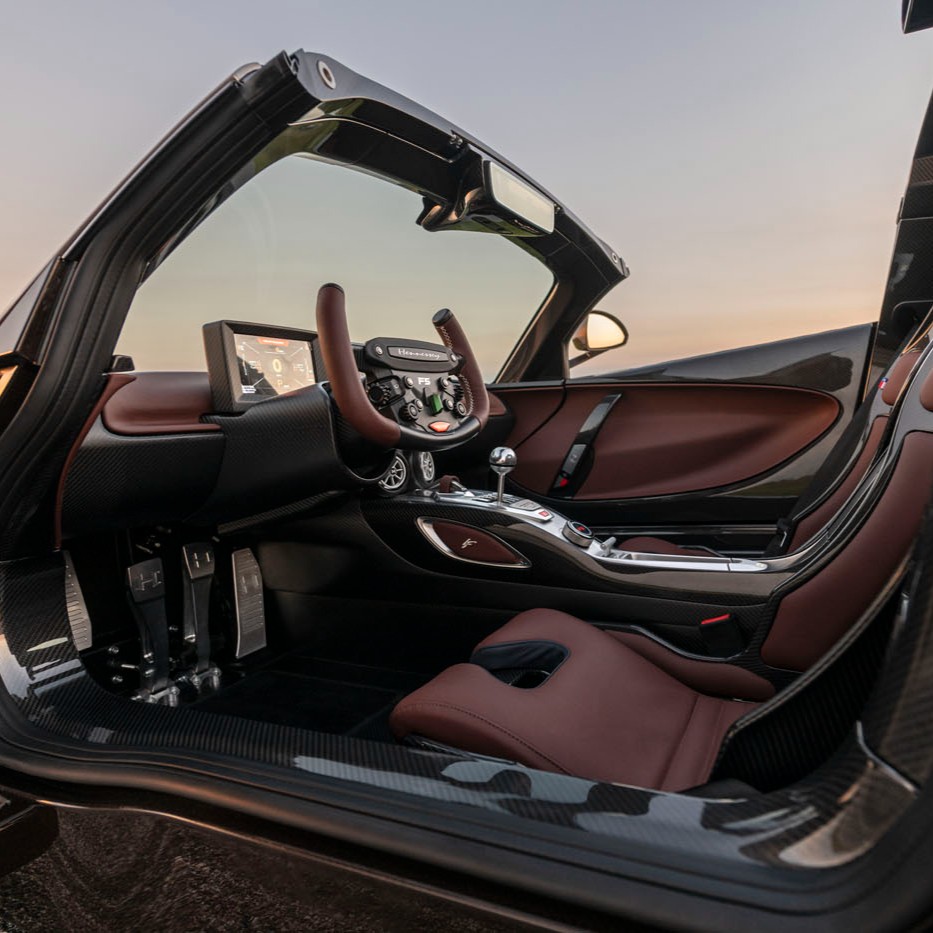 El apartado estético del Venom F5 Revolution LF es igual de exclusivo que su mecánica. El vehículo prescinde por completo de pintura tradicional, exhibiendo de manera audaz la textura de la fibra de carbono con un acabado especial en un tono único denominado «Cocoa Brown» (Marrón Cacao). Este tratamiento se aplica no solo sobre la carrocería, sino también sobre una nueva bañera o chasis monocasco, fabricada específicamente en este material compuesto para este ejemplar. Además, cuenta con un paquete aerodinámico exclusivo que refuerza su carácter agresivo y funcional.