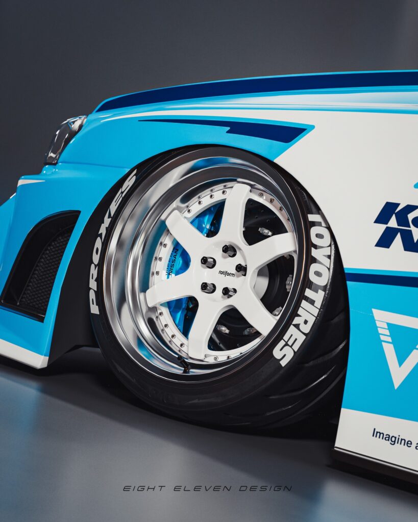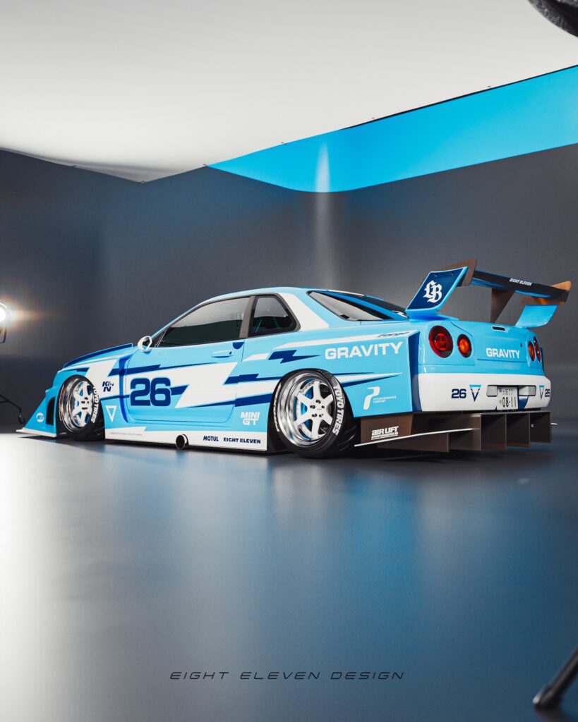 La base del proyecto es la generación ER34 del Nissan Skyline, un modelo venerado por los entusiastas del rendimiento nipón. Sin embargo, la interpretación de EightEleven trasciende el mero rediseño. Inspirándose en la estética de los Super Silhouette –una categoría histórica de automovilismo japonesa donde carrocerías de producción montaban chasis y mecánicas de prototipo de carreras–, el concepto explora una evolución radical. Las líneas se extienden y se afilan, integrando elementos aerodinámicos masivos, alerones prominentes y un lenguaje visual que prioriza la carga aerodinámica y la agresividad sobre la forma original de calle.