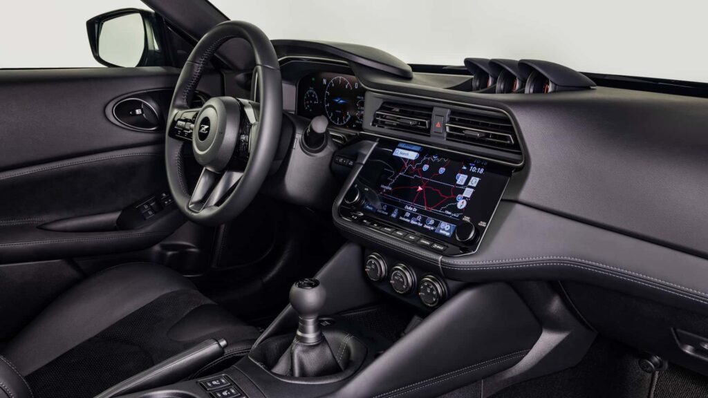 La gama Nissan Z 2026 se mantiene con tres niveles de equipamiento. El Z Sport funciona como versión de acceso, equipado de serie con una pantalla de 8 pulgadas con integración para Apple CarPlay y Android Auto, volante forrado en cuero y llantas de 18 pulgadas con neumáticos Yokohama ADVAN Sport.