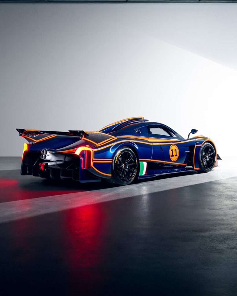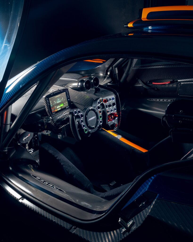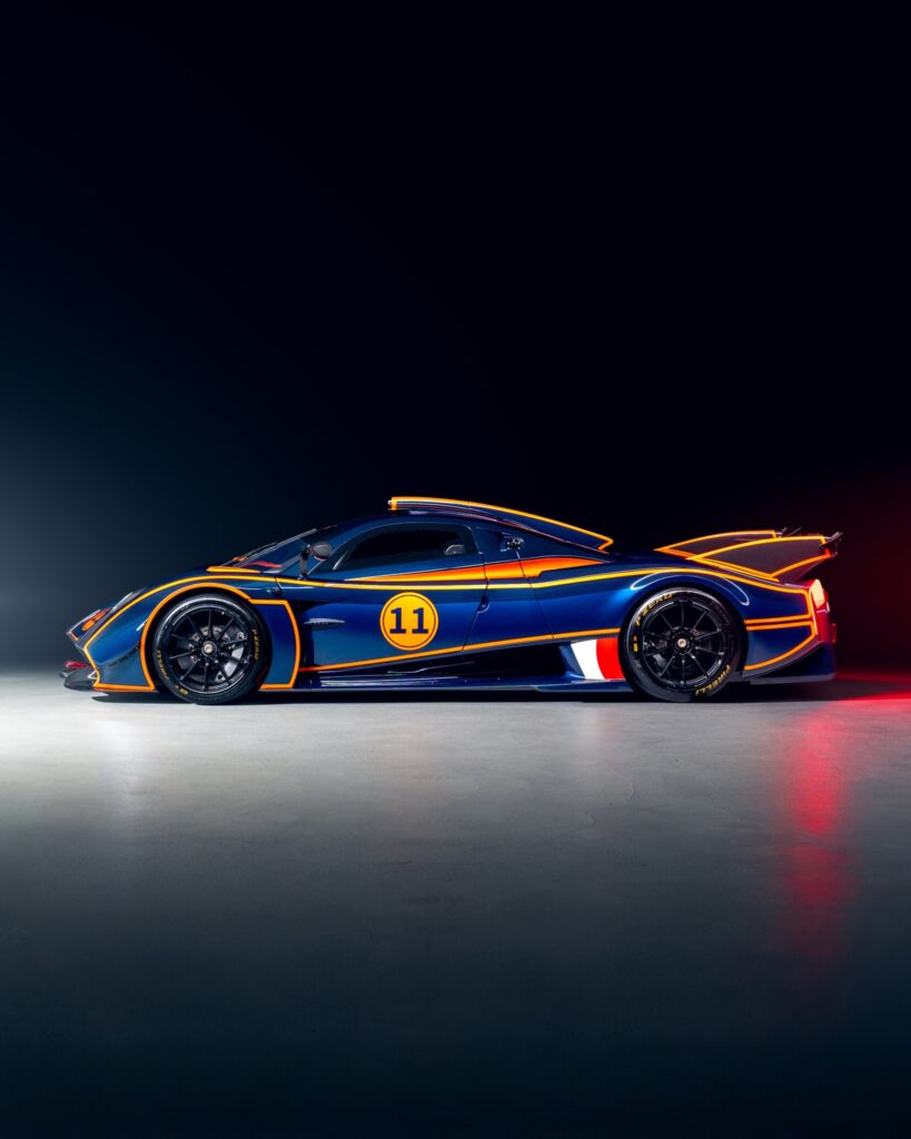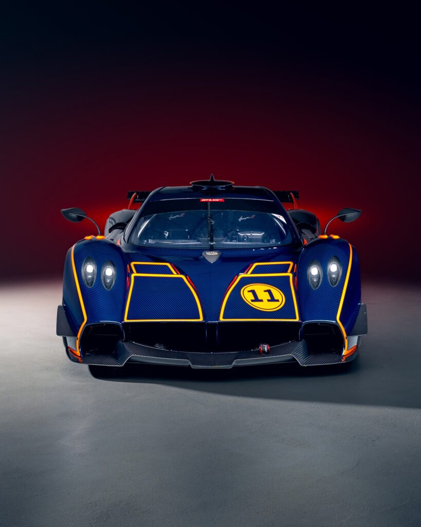 Un ejemplar específico, identificado como la unidad 11 de una serie limitada a 30, ha captado la atención por su acabado exterior. La carrocería combina los tonos Blue Danubio, Blue Avio y Arancio Marbella sobre la textura de la fibra de carbono. El interior confirma su orientación competitiva, integrando asientos con homologación FIA GT, una estructura de protección antivuelcos y un sistema de información específico para entornos de competición.