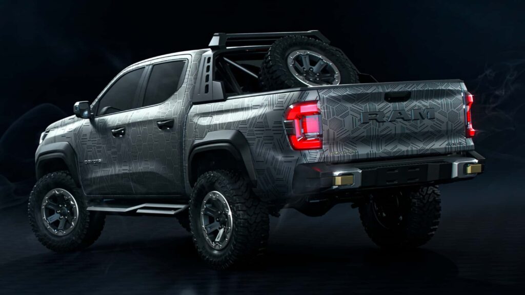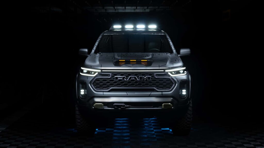 El debut se realizará con el concepto Nightfall, una versión equipada para aventuras extremas. Incluye neumáticos de 33″, rines beadlock de 18″, suspensión Fox, cabrestante integrado y protecciones inferiores en bronce. El diseño conserva el ADN de Ram: parrilla trapezoidal con el logotipo de la marca, barra LED conectando los faros y entradas de aire en el capó con detalles en luces naranjas, inspiradas en modelos como la 1500 RHO y TRX.